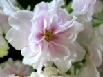 Крупные махровые белые цветы с волнистым краем и розовой